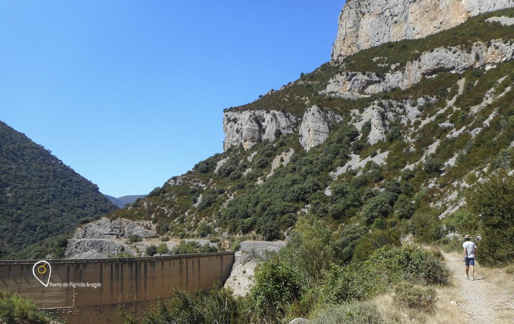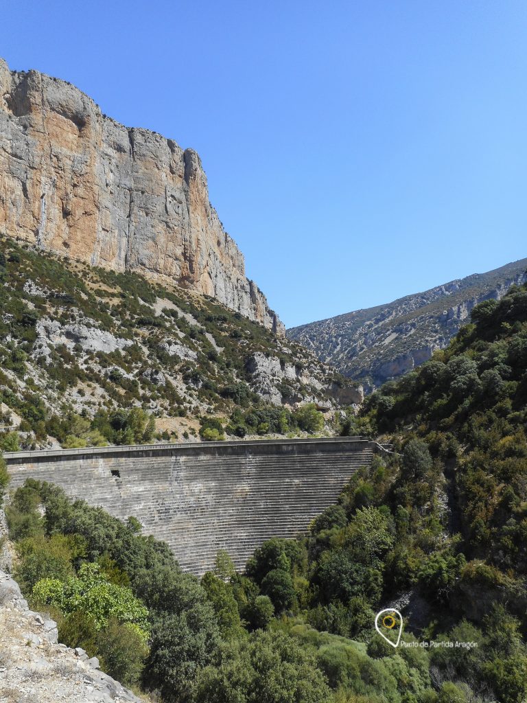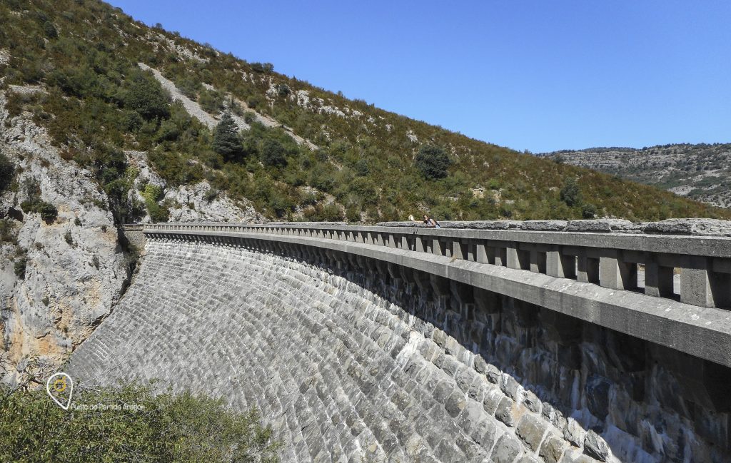 En 20 minutos desde que empezamos estamos cruzando la Presa de Belsué. Tras atravesarla, podemos seguir el camino de la izquierda o el de la derecha, ambos conducen al Dolmen, a pesar de que las indicaciones de los carteles han sido arrancadas o se han estropeado. Comienza realmente en este punto el tramo circular de la excursión pudiendo elegir el sentido en el que deseamos realizarla. Nosotros optamos por el de la izquierda, nos dirigimos al Dolmen a través del embalse de Cienfuens.