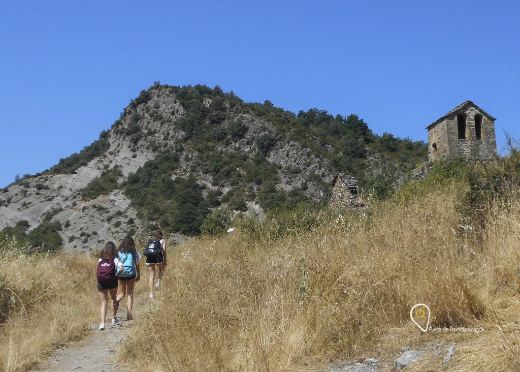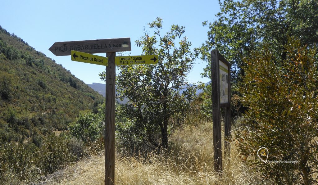 Desde el aparcamiento, sale una pista que cruza el río en dos ocasiones hasta llegar junto a las ruinas de Santa María de Belsué.