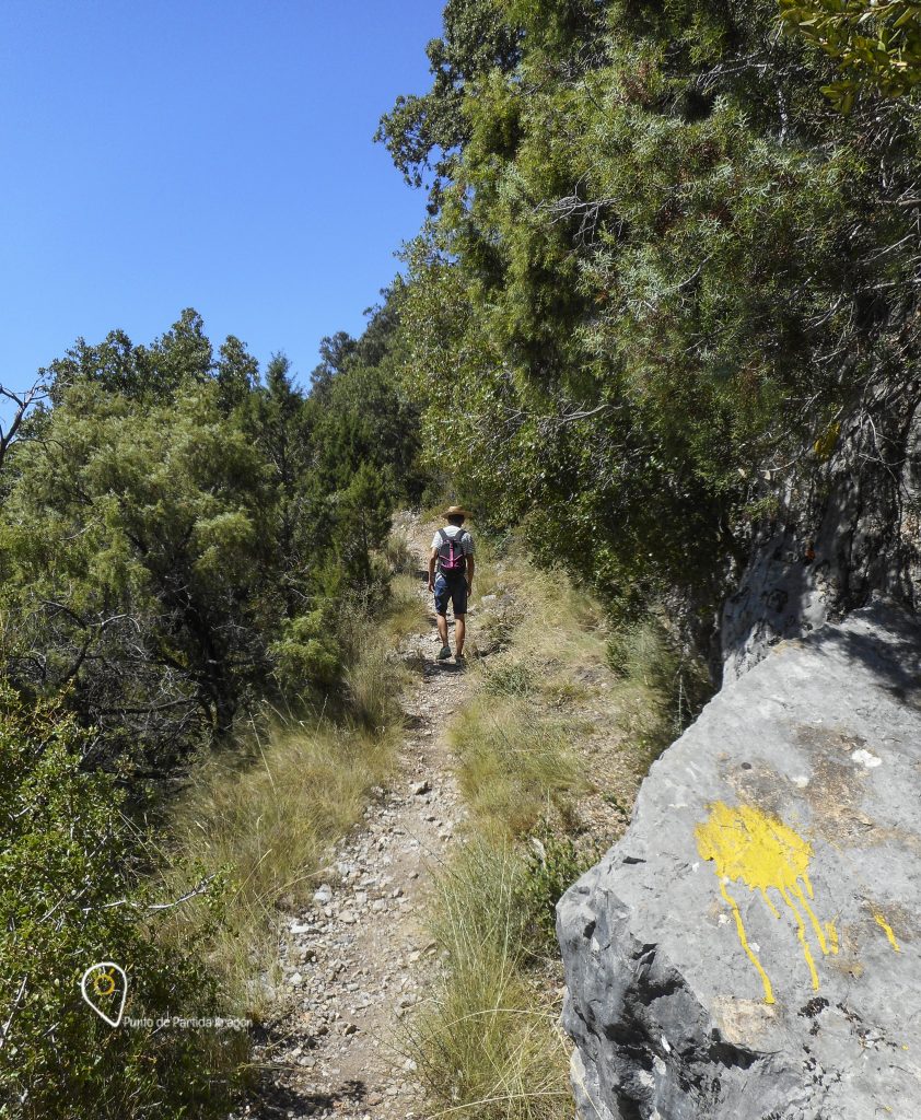 Pocos metros más adelante veremos que el camino se estrecha y encontraremos una bifurcación. A pesar de que aquí también están borradas las indicaciones, queda el poste de madera que nos da la pista del camino correcto: debemos seguir por el camino de la derecha. En el recorrido vamos a ir encontrando unos brochazos de pintura amarilla que son la pista para no perdernos.