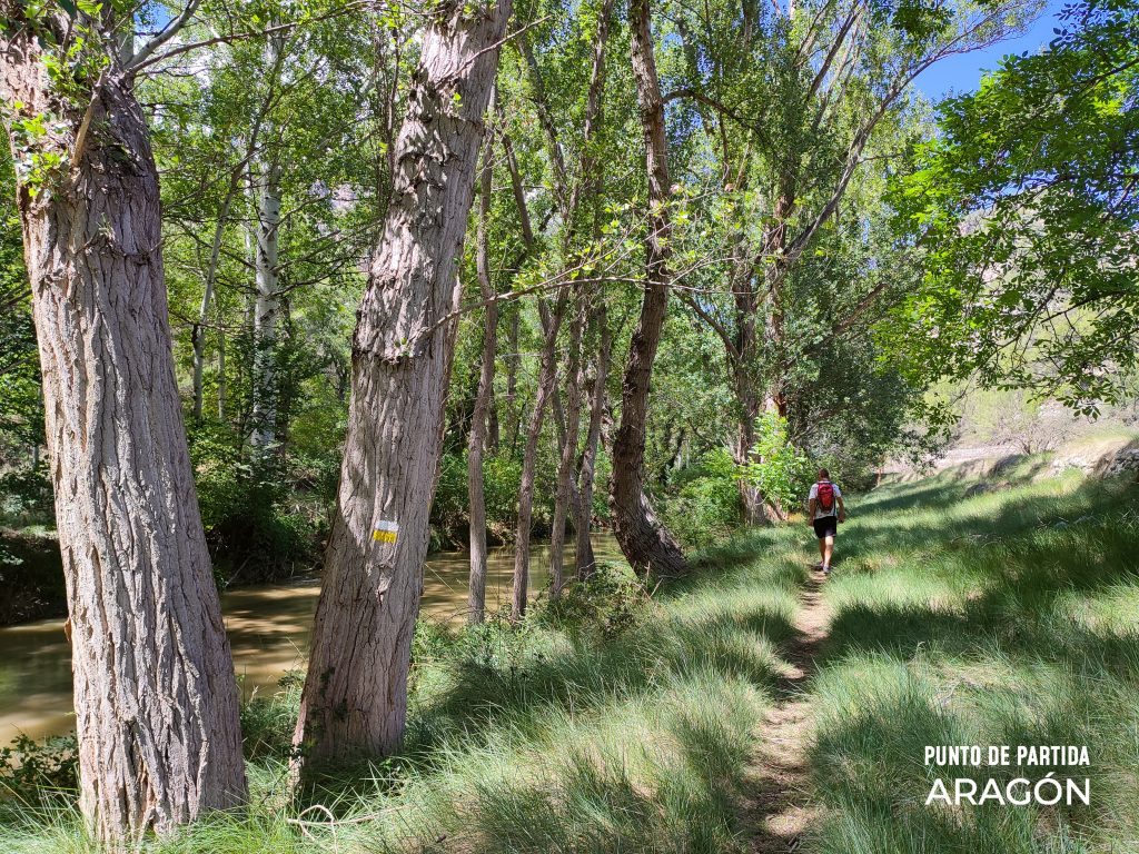 Una pasarela elevada, instalada en las últimas fases de acondicionamiento del PR-TE 10, nos ayuda a cruzar el cauce del río y comenzamos a caminar remontando el río Guadalope que, durante un buen rato, va a discurrir a nuestra derecha.
