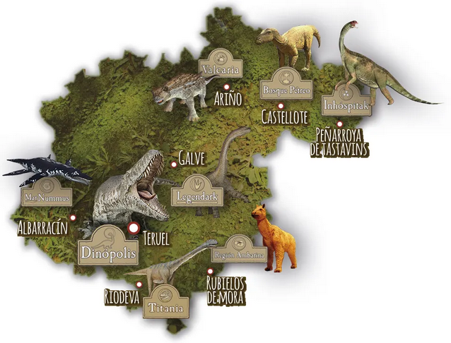 Además del parque principal, hay otras siete sedes más ubicadas en siete localidades de la provincia de Teruel en las que ha habido hallazgos paleontológicos de relevancia internacional, cada una tiene una temática diferente.