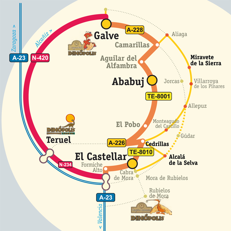 Los dos municipios de referencia son El Castellar y Galve, ya que sólo entre los dos tienen cinco yacimientos de huellas de dinosaurios perfectamente habilitados para la visita, además de otros recursos museográficos y turísticos relacionados con el geoturismo y los dinosaurios.