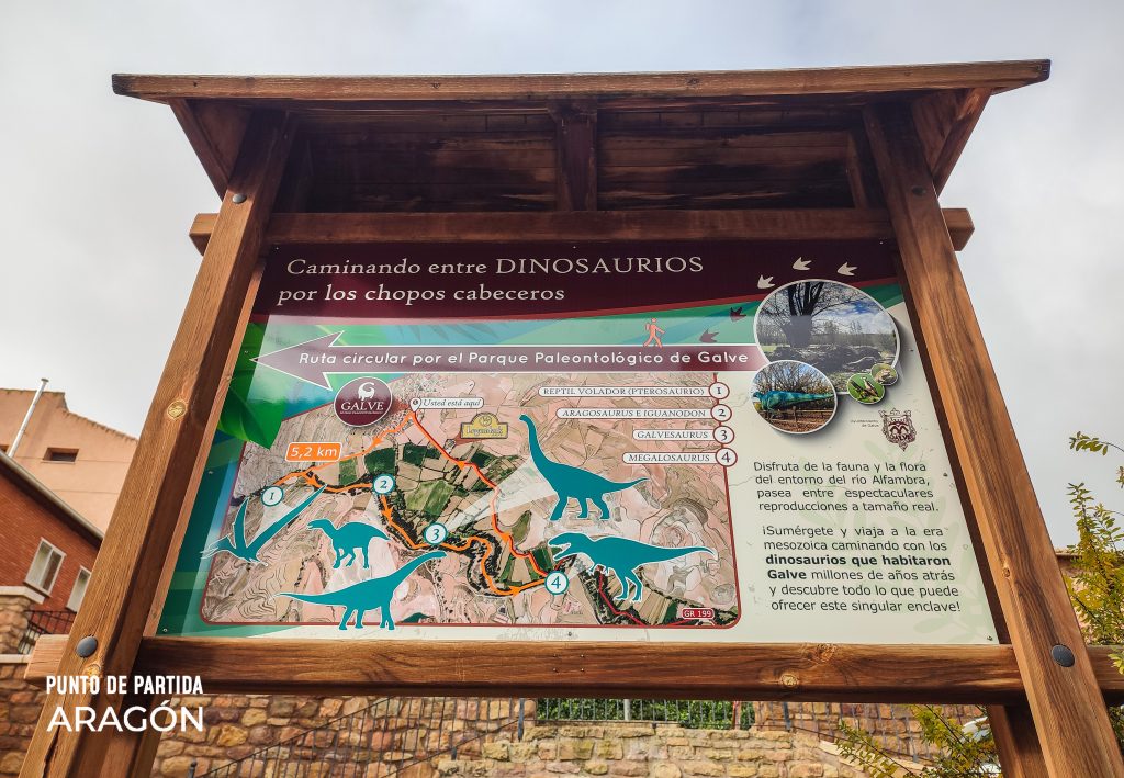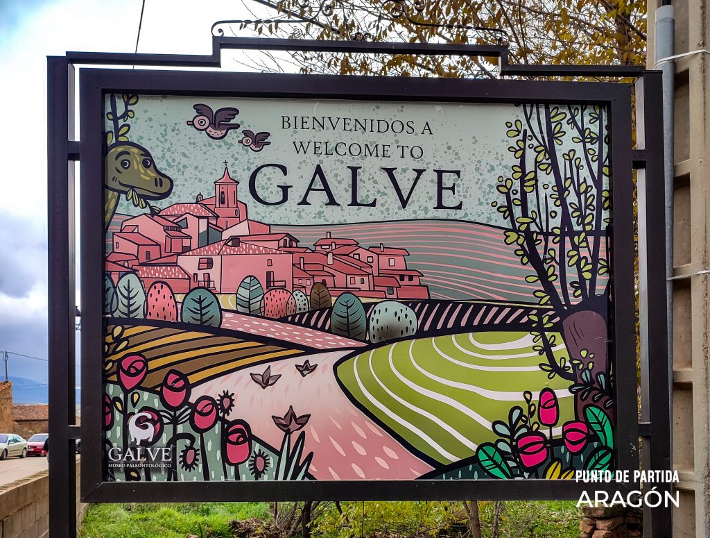 Un colorido cartel nos da la bienvenida al llegar a Galve, en él, un dinosaurio asoma por un lateral; y es que en Galve es posible retroceder unos 145 millones de años atrás y convivir con los seres que entonces habitaban la Tierra.