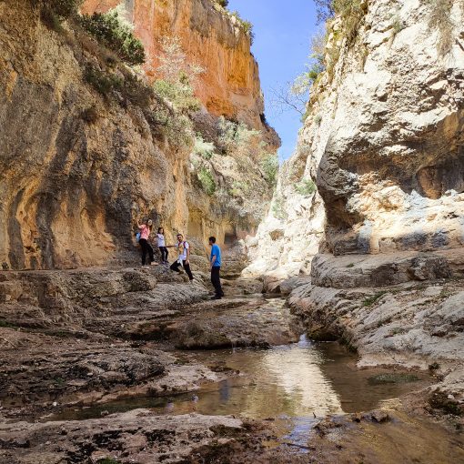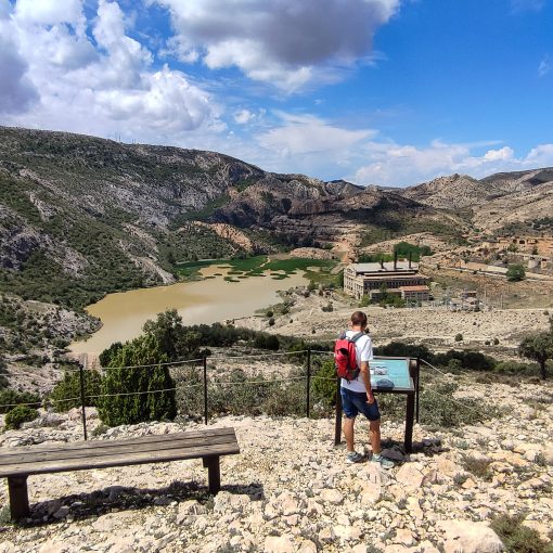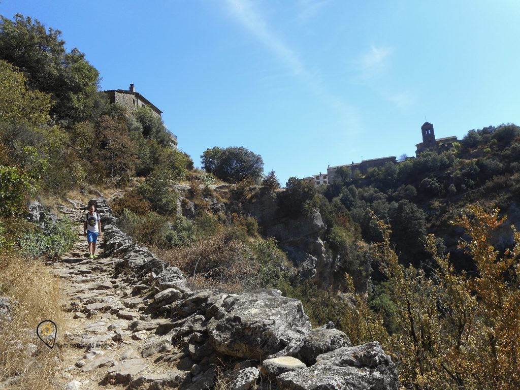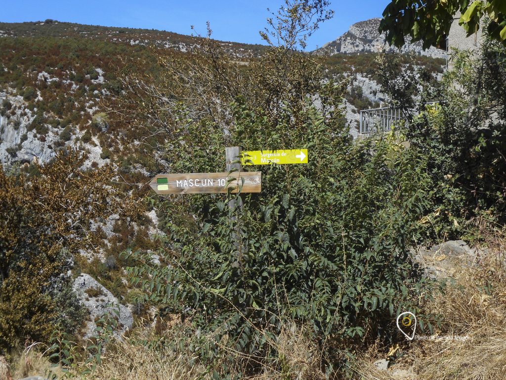 Una vez atravesamos estas casas, encontramos los postes de ruta. Como verás en la imagen, el de la derecha indica «Surgencia de Mascún», es decir, por aquí también podríamos llegar a esta fuente natural que luego visitaremos, aunque haciéndolo por la parte alta del barranco. Nosotros optamos por seguir el cartel que marca «Mascún 10´» iniciando un vertiginoso descenso que, en los mencionados 10 minutos nos conducirá al fondo del barranco. Esta no es una ruta difícil, pero, si tiene alguna complicación, está en este primer tramo ya que el desnivel es acusado y las piedras están tan pulidas que resbalan, con un poco de precaución y calma lo haremos sin problema.