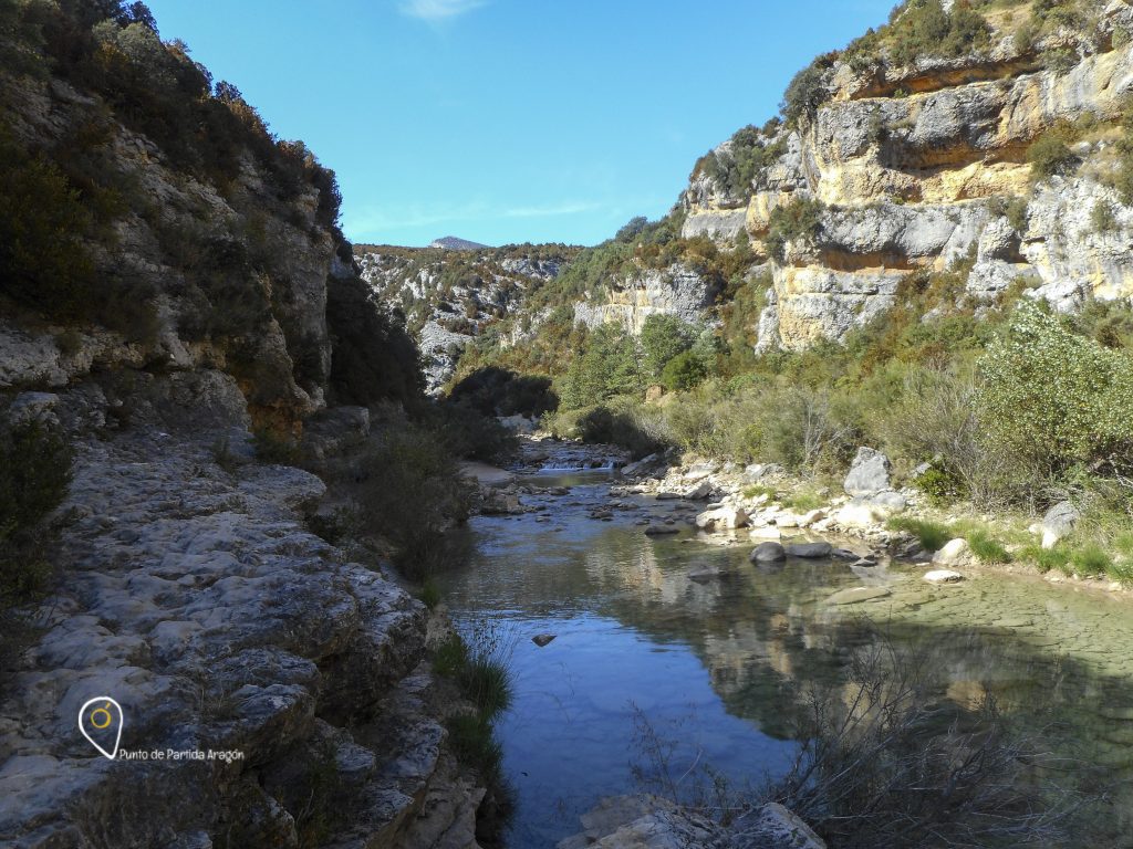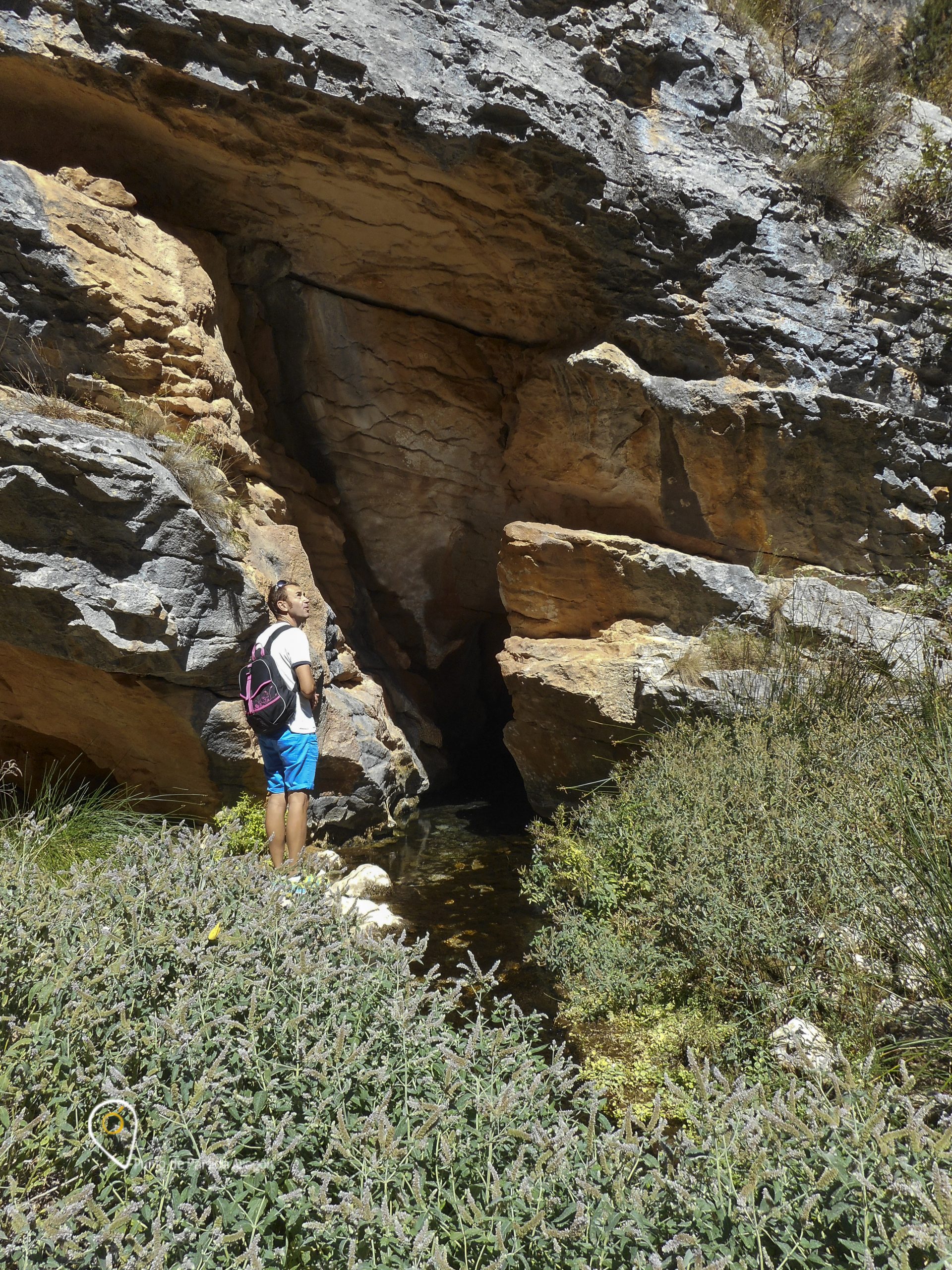 Continuando nuestro recorrido llegamos por fín a la surgencia del Mascún, un manantial permanente de agua que brota al exterior en este punto, fruto de las filtraciones producidas en este área montañosa de origen calizo. Hasta aquí hemos tardado media hora yendo muy tranquilos, fácil ¿verdad?