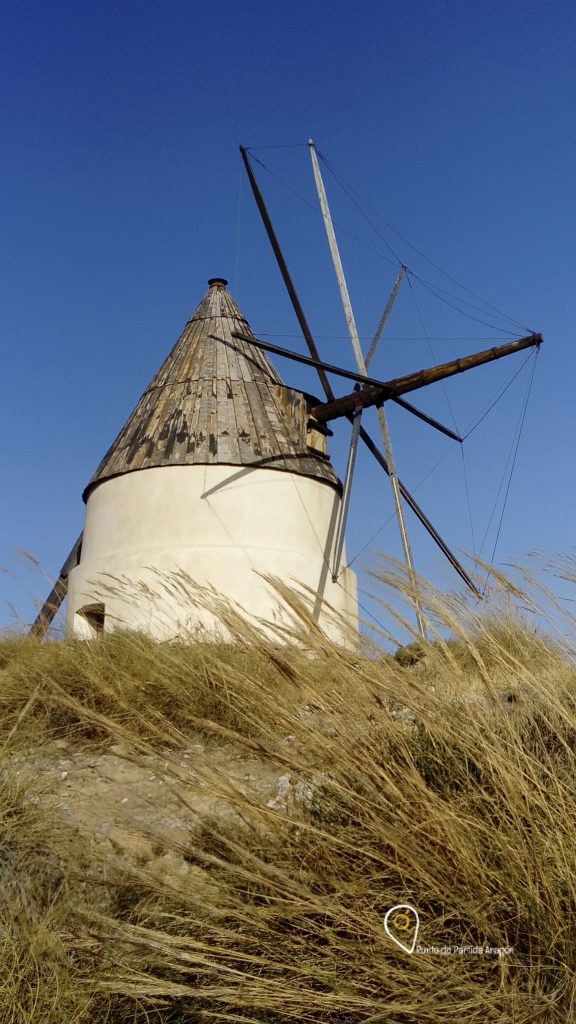 Por último, dejadme que os recomiende algo más. En un collado entre San José y el Campillo de los Genoveses se sitúa el Molino del Collado de los Genoveses. El árido paisaje de Cabo de Gata está salpicado de estas construcciones, molinos de viento que, con sus puntiagudos techos (cuando lo conservan), se han convertido en una silueta característica del paisaje. Siluetas que nos hablan de cómo, a falta de agua, las fuertes corrientes de la zona se convirtieron en la principal fuente de energía para mover las piedras que molían el trigo.