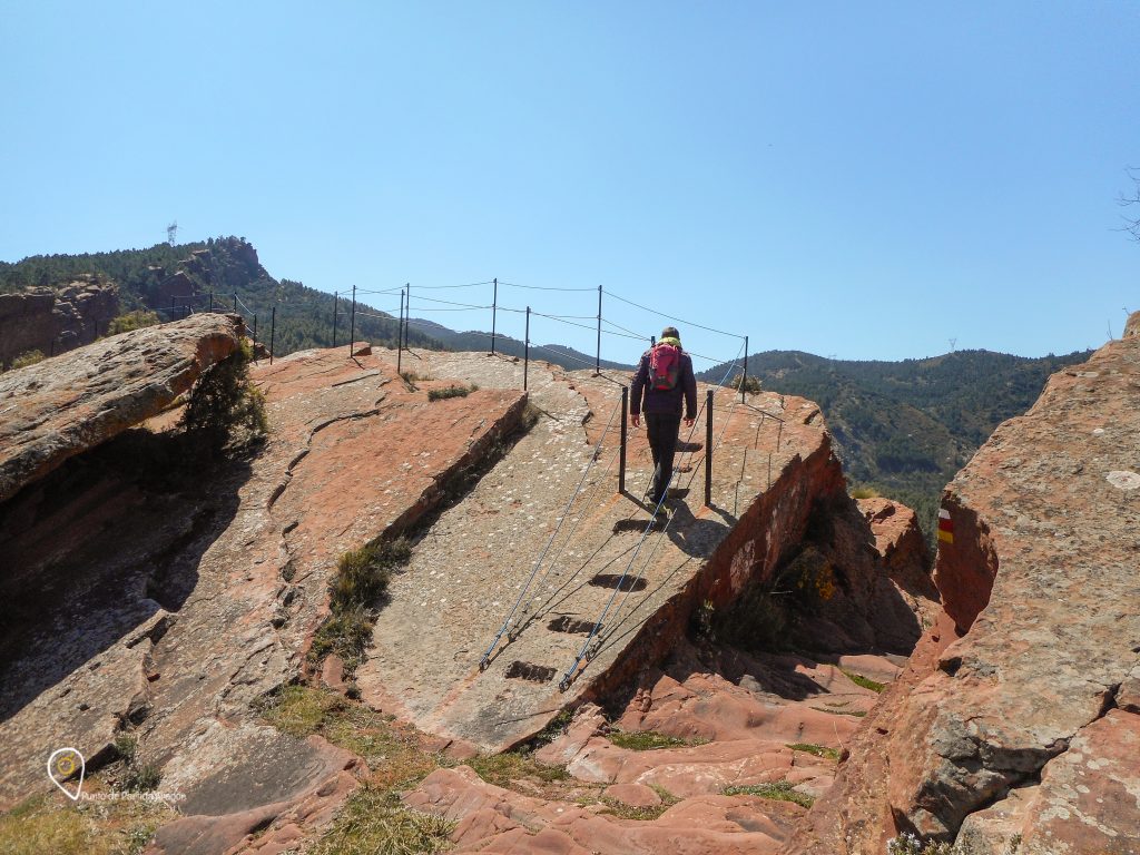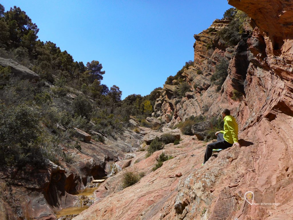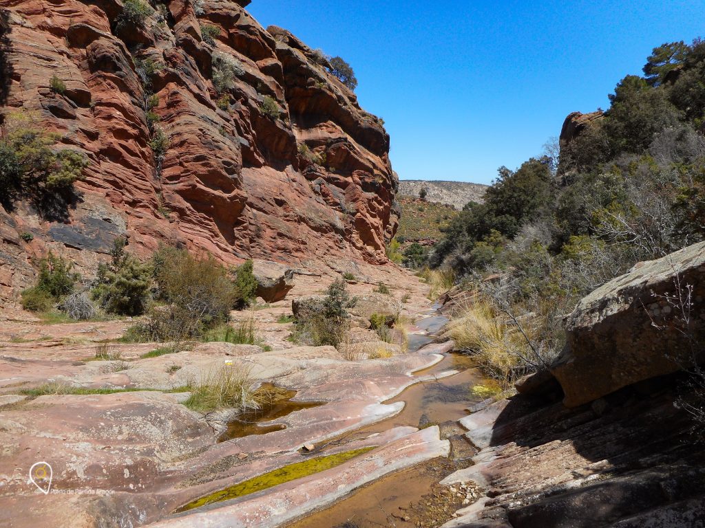 El hocino que da nombre a esta ruta, el Barranco de la Cingla, se empieza a divisar desde arriba. Comenzamos el descenso hasta el lecho rocoso del barranco y, durante un rato, de nuevo caminamos rodeados de peñascales de rodenos, los que ha tallado el barranco de la Cingla, junto al curso del agua, no muy abundante, por cierto. Es una zona preciosa, digna de un ataque de los indios a los vaqueros, al menos eso iba pensando yo.
