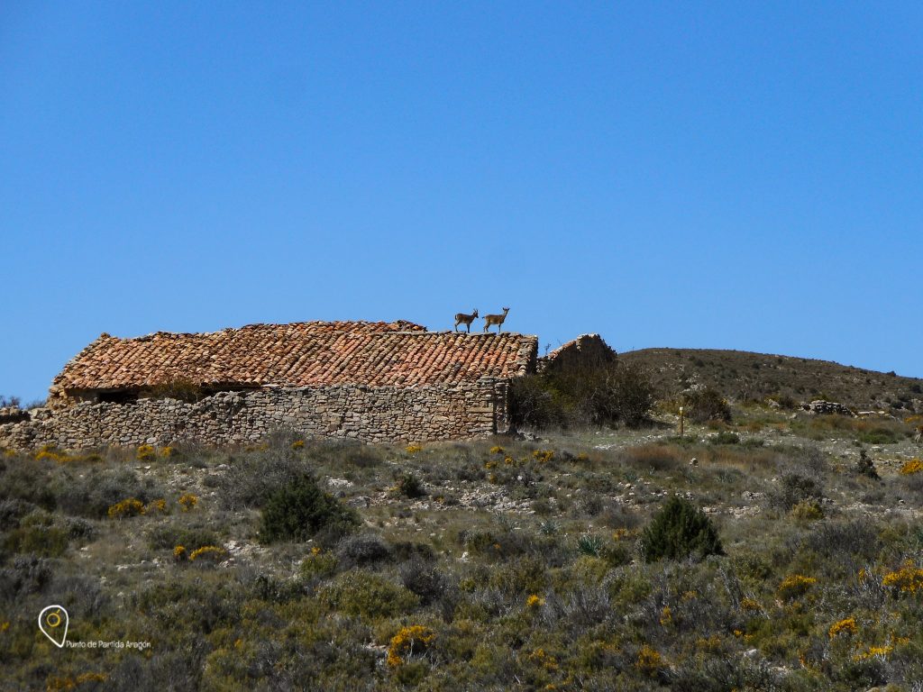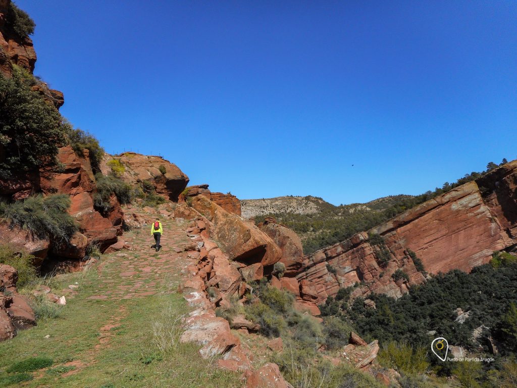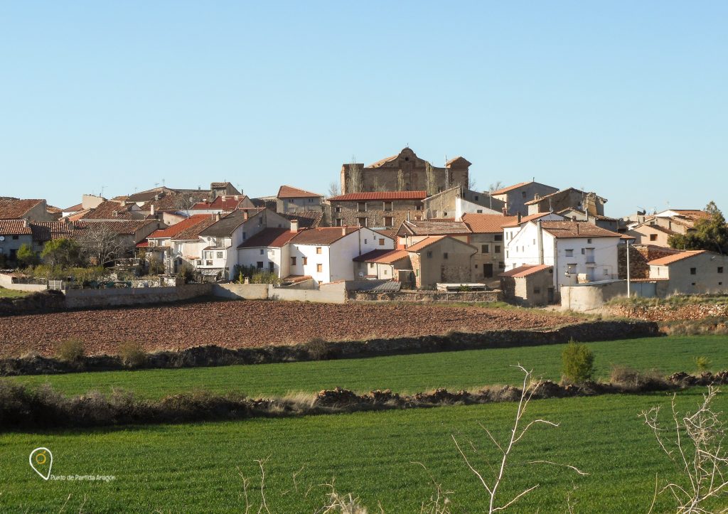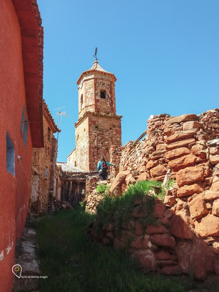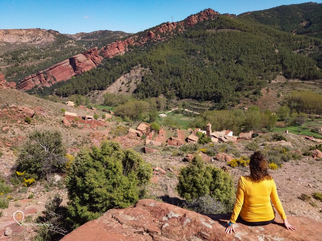 Sólo nos queda seguir la senda por la ladera, bajo el escarpe de la cantera de rodeno que llega ya hasta el pueblo. Al final se pasa junto al Corral del Albergue y varias casas en ruinas hasta llegar al peirón que vimos al inicio. Es una senda muy cómoda que, conforme nos acerca al pueblo, nos ofrece de nuevo unas vistas impresionantes del mismo.