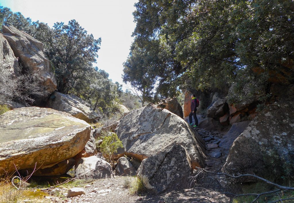 El paisaje ha cambiado, ahora predominan las negras pizarras y las areniscas grises. Pinos aislados, carrascas y quejigos. Mares amarillos de aliaga y los malvas del tomillo y romero en flor. Recomiendo hacer esta ruta en primavera para disfrutar de este espectáculo de colores y, en cualquier caso, no la recomiendo en verano ya que hay zonas extensas sin apenas sombra.