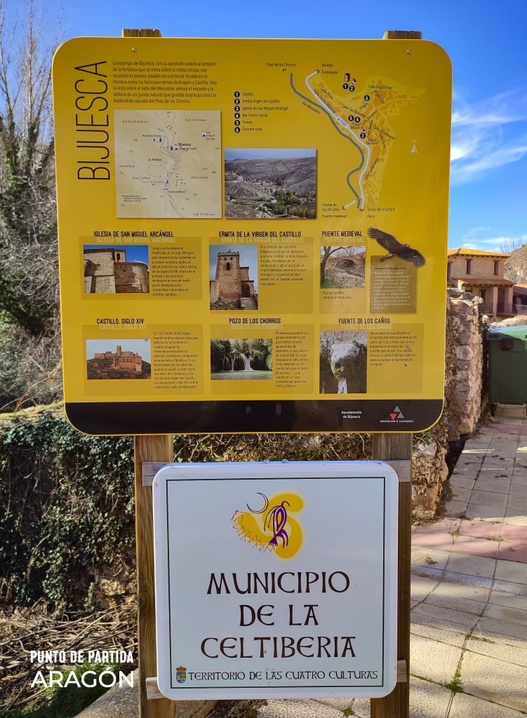 Continuamos hasta el pueblo y en la entrada nos encontramos un panel con los puntos de interés del pueblo y la señal «Municipio de la Celtiberia. Territorio de las cuatro culturas» (más tarde volveremos a encontrar otro en Torrelapaja). La verdad es que nosotros desconocíamos esta red de municipios, no se si por nuestra ignorancia, porque es reciente o porque no se le ha dado la debida difusión. Si sabes algo más, cuéntanos en los comentarios.