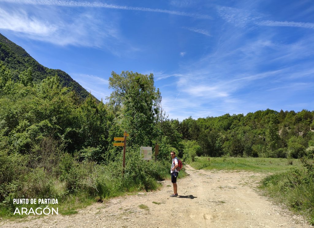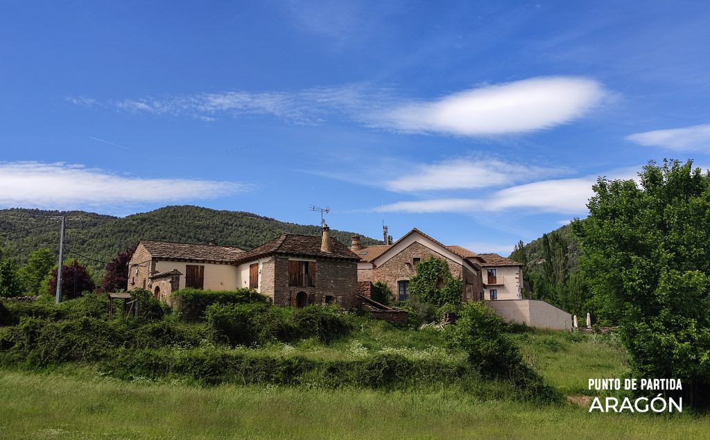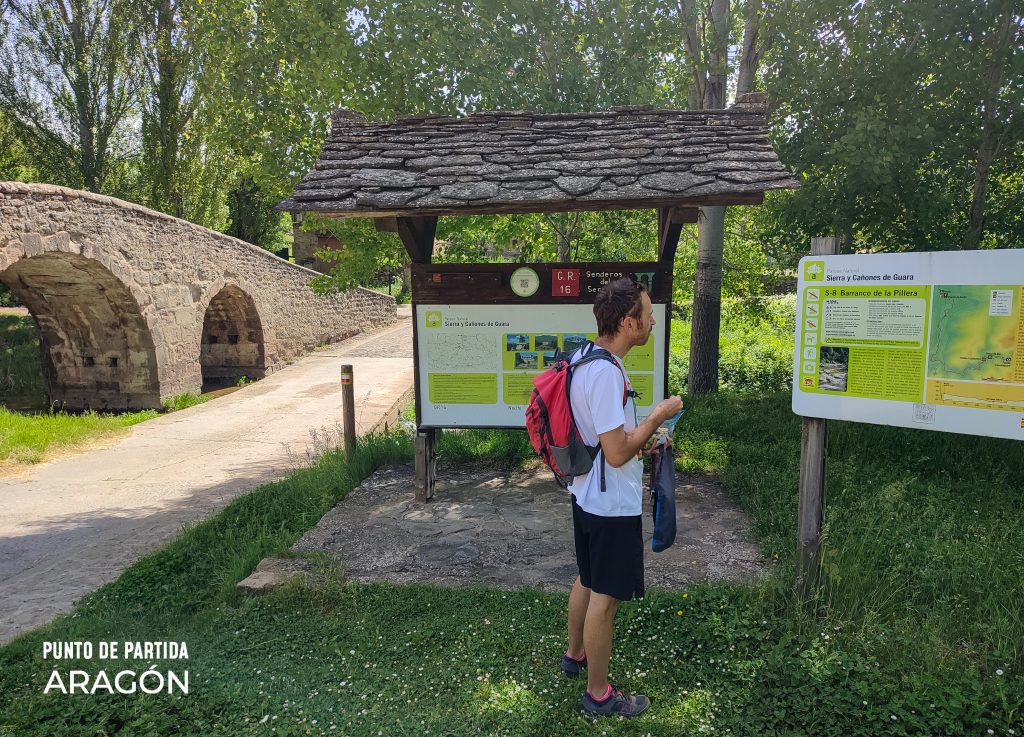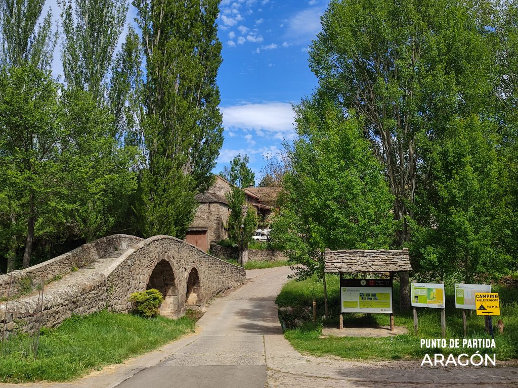 Para comenzar, nos situaremos junto al puente medieval. El cartel del sendero S-8 indica que recorramos «la calle principal que atraviesa el pueblo hasta tomar el desvío señalizado a mano derecha y que coincide con un tramo del Camino Natural de la Hoya de Huesca, con lo que se debe seguir su señalización».