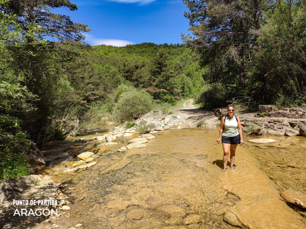 Tras coger todo lo que necesitamos para nuestra aventura y calzarnos las sandalias de agua (o el calzado que hemos decidido que se puede mojar), seguimos la primera señal en dirección Barranco de la Pillera y vadeamos el río por primera vez.