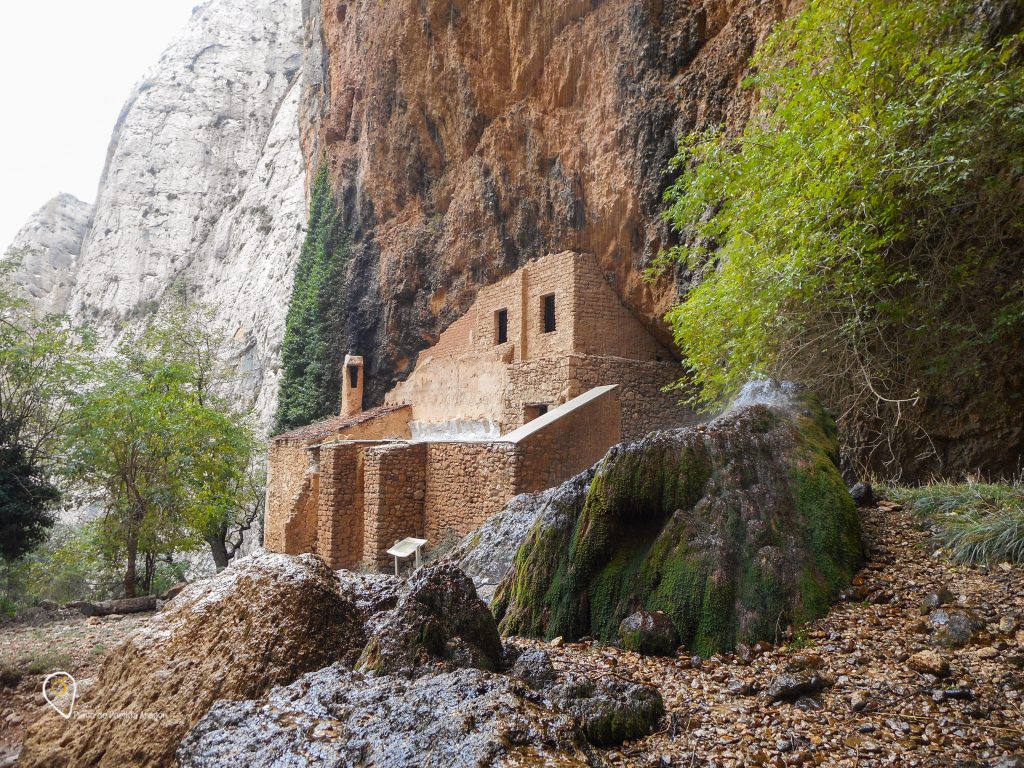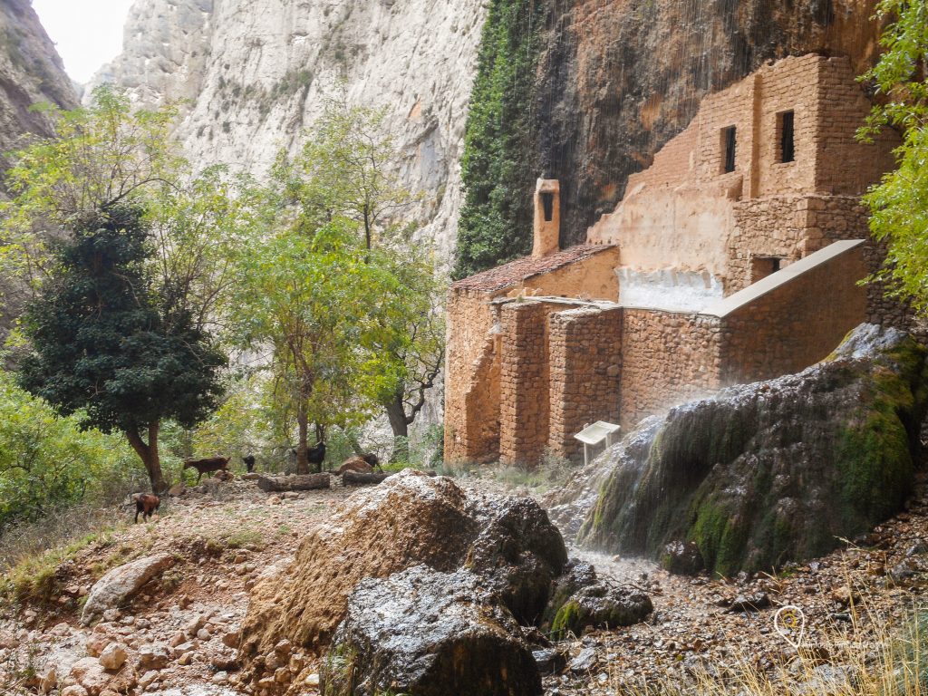 Y finalmente llegamos hasta el santuario, la ermita rupestre se encuentra en un singular circo de roca, junto a una cascada de más de 30 metros. El paisaje es espectacular y el momento mágico ya que, al llegar, nos encontramos un rebaño de cabras salvajes que, lejos de asustarse, nos acompañaron un buen rato. Y no es la primera vez que hoy vemos cabras, varias veces a lo largo del trayecto su fuerte olor las delataba y ahí aparecían, bien cerca, muchas veces en el camino mismo.