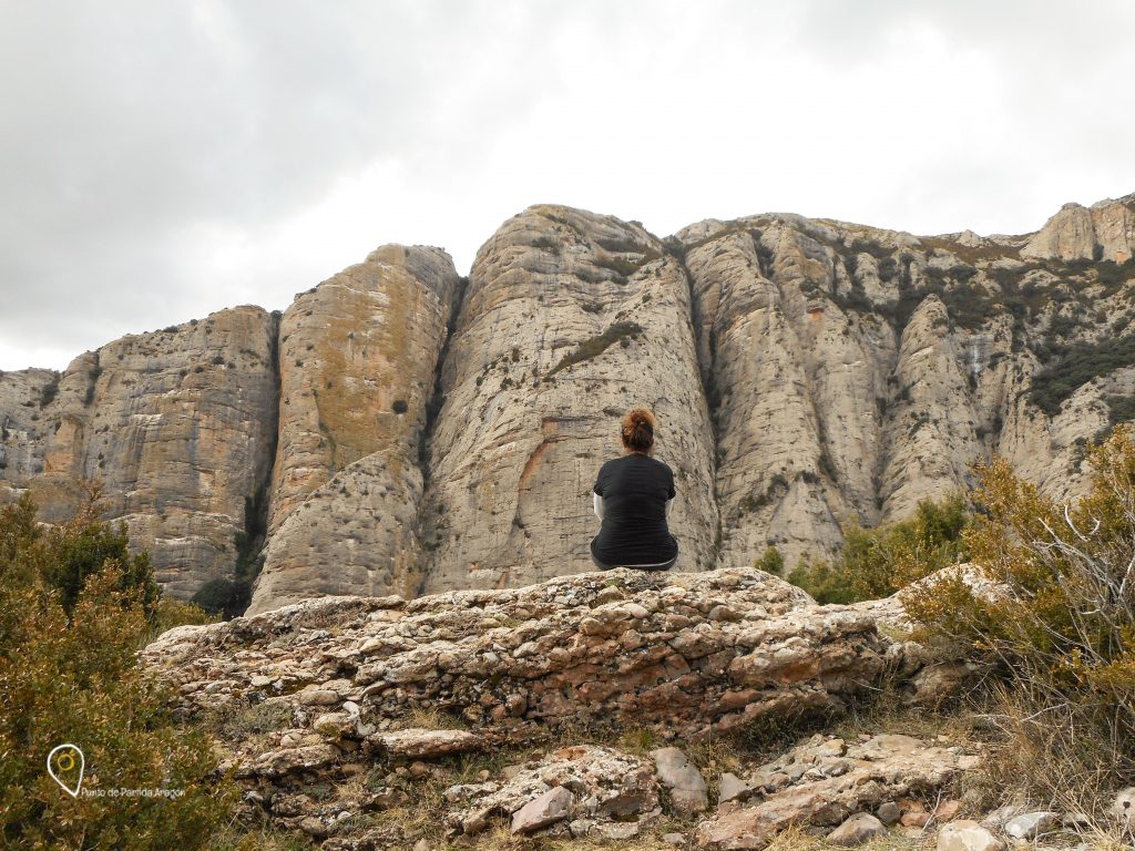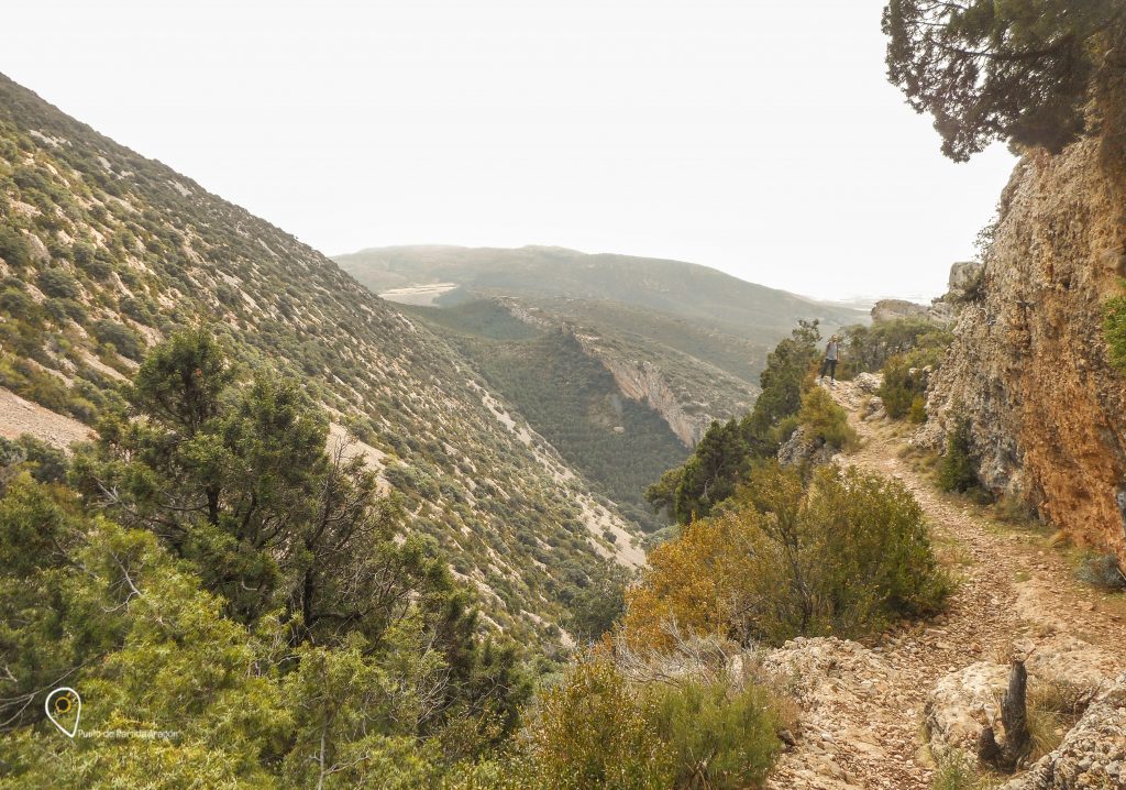 El camino comienza por una senda que mostrará frente a ti el Salto de Roldán, a la izquierda, y «las alpargatas», a la derecha, curiosas formaciones calcáreas que recuerdan varias alpargatas asomando del terreno.