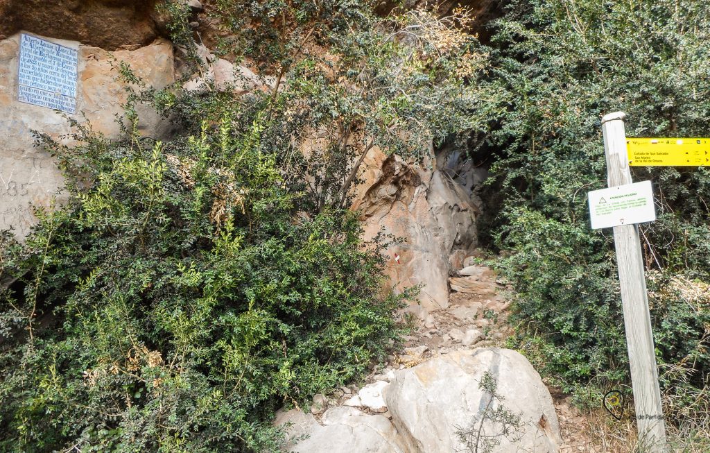 Hemos llegado al punto que más conflicto os puede generar en la ruta. A día de hoy, y así lo encontraréis en la mayoría de las webs (incluida la Red de Senderos Turísticos de Aragón, a quienes hemos enviado ya un mensaje), se ofrece al senderista dos opciones: la vía de la izquierda, conocida como el paso de la Viñeta es señalada como más rápida y recomendada en la mayoría de los casos; la otra opción es seguir por la vía de la derecha, conocida como Senda de los burros, más larga pero más segura. Al respecto debemos advertir que el Parque Natural de la Sierra y Cañones de Guara dice lo siguiente: «Las dos alternativas que se presentan conducen al Collado de San Salvador, siendo la del paso de la Viñeta peligrosa y poco recomendable (…), por lo que el Parque Natural ha eliminado este paso de la red de senderos»