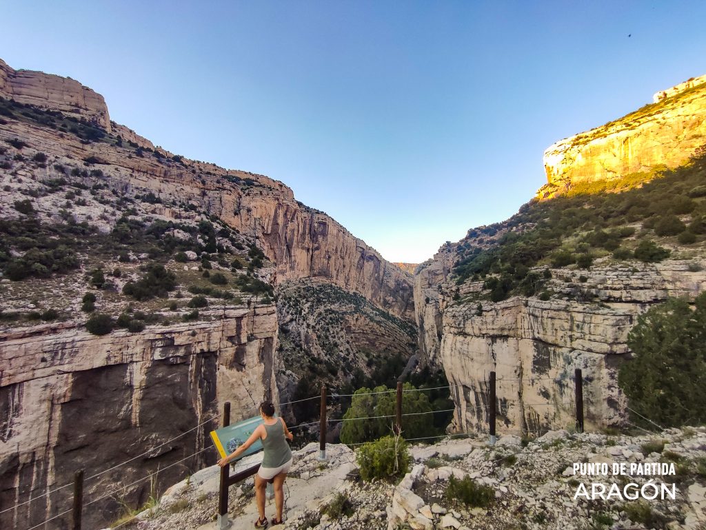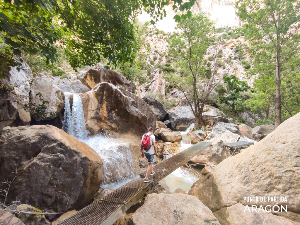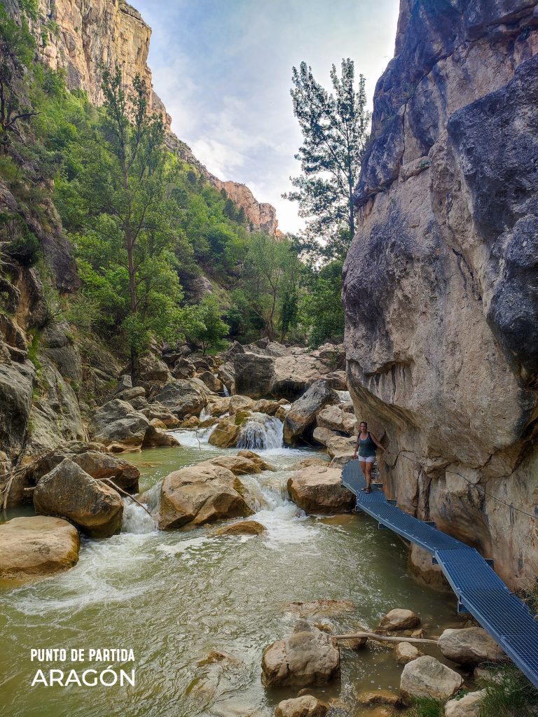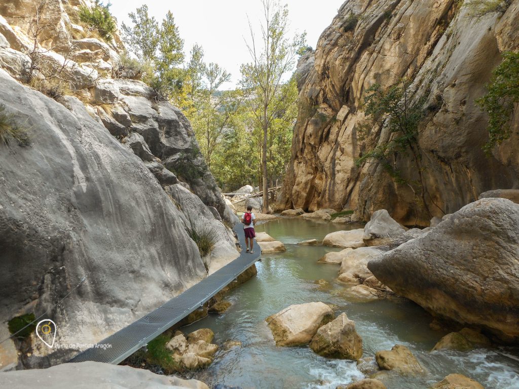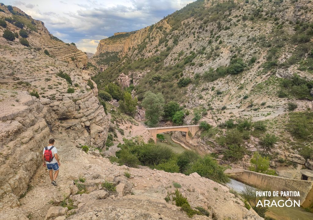 Al empezar, el sendero transcurre por la parte alta de la margen izquierda del río Guadalope, pero pronto desciende y, mediante una pequeña pasarela, atraviesa por primera vez el cauce.