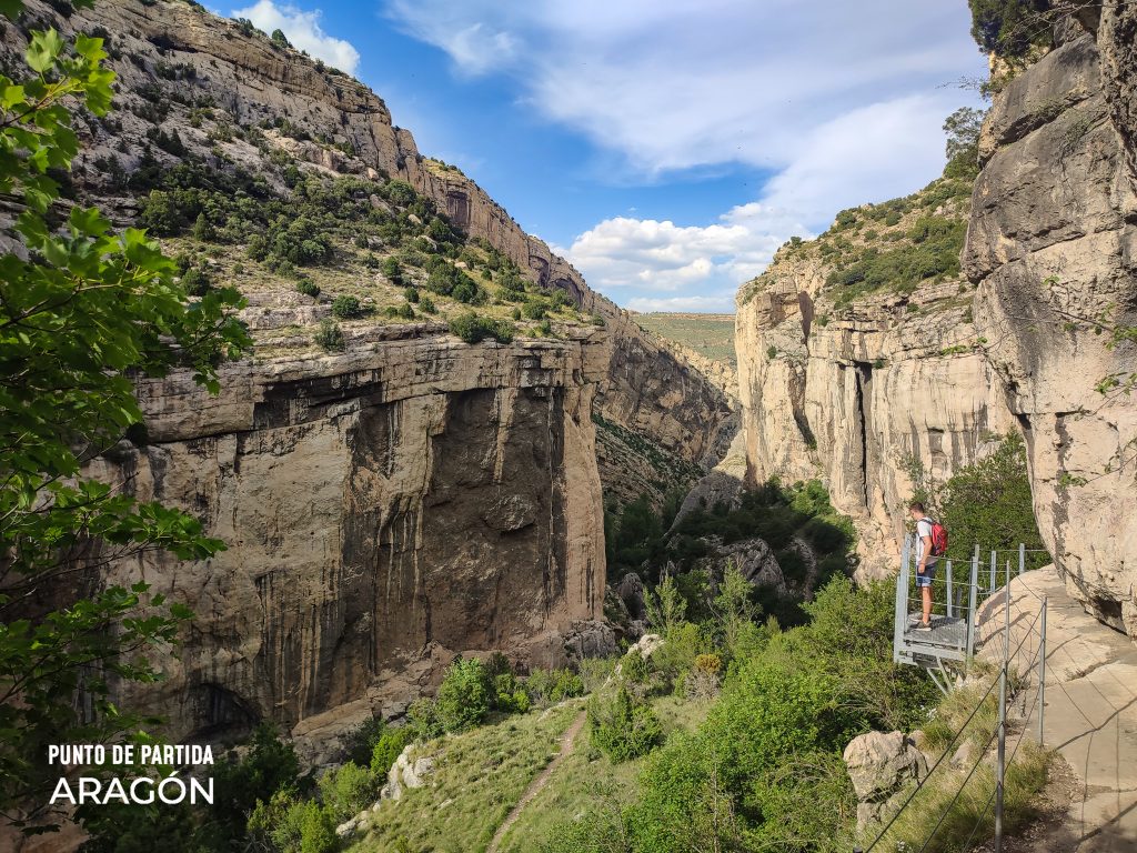 A partir de aquí, emprendemos la bajada más pronunciada de toda la ruta que nos llevará por un camino polvoriento, tortuoso, muy resbaladizo y estrecho hasta el cauce del río Guadalope. Es un tramo difícil, aunque cuenta con algún asidero, peldaños metálicos y hasta alguna escalera de madera para ayudarnos.