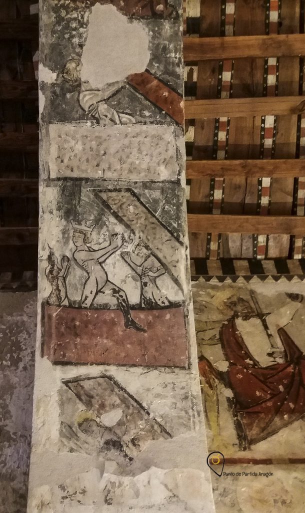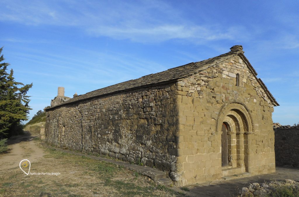 La estampa de esta Ermita ya es curiosa, situada en el recinto del pequeño cementerio del pueblo desde el que, por cierto, se ve el Castillo de Montearagón, donde acabamos de estar. Con un exterior sencillo de estilo románico tardío, la sorpresa viene cuando entramos y contemplamos las pinturas de estilo gótico lineal que, por cierto, están muy bien conservadas y fueron restauradas en 2003.