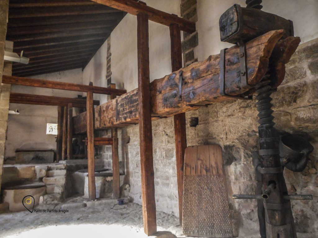 Detrás de la Ermita y, tras dar un corto y agradable paseo entre carrascas, llegamos al molino rehabilitado donde nos explican la elaboración tradicional del aceite. Se conserva una enorme prensa accionada con una descomunal viga que tiene unas inscripciones centenarias. Ademas de ello, toda una serie de elementos y útiles: los algorines para almacenar las olivas, el ruello para machacarlas, las pilas de piedra en las que caía el aceite, las esteras para el prensado… Gracias a las estupendas explicaciones entendemos lo costoso que debió ser en el pasado obtener el aceite.