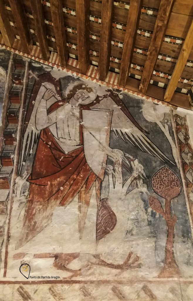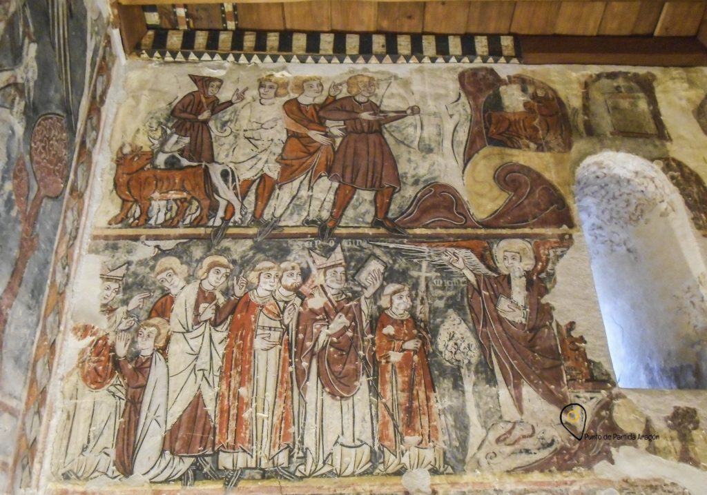 La escena mejor conservada se encuentra en el muro sur y, como se cuenta en la web romanicoaragones.com , relata la aparición de San Miguel en el monte Gargano